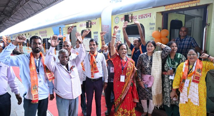 रायपुर, 18 सितम्बर 2025 : श्रीरामलला दर्शन योजना के तहत भारत गौरव ट्रेन बिलासपुर संभाग के 850 श्रद्धालुओं को लेकर अयोध्या धाम के लिए रवाना हुई। बिलासपुर रेलवे स्टेशन पर इस विशेष ट्रेन को जिला पंचायत के अध्यक्ष श्री राजेश सूर्यवंशी ने हरी झण्डी दिखाकर रवाना किया। इस अवसर पर मुंगेली जिला पंचायत के अध्यक्ष श्री श्रीकांत पांडे, बिलासपुर जिला पंचायत के सीईओ श्री संदीप अग्रवाल, पूर्व महापौर श्रीमती वाणी राव और नगर निगम के सभापति श्री विनोद सोनी सहित अनेक जनप्रतिनिधि, जिला प्रशासन, छत्तीसगढ़ टूरिज्म बोर्ड के अधिकारी-कर्मचारी तथा रेलवे के कर्मचारी उपस्थित थे।
