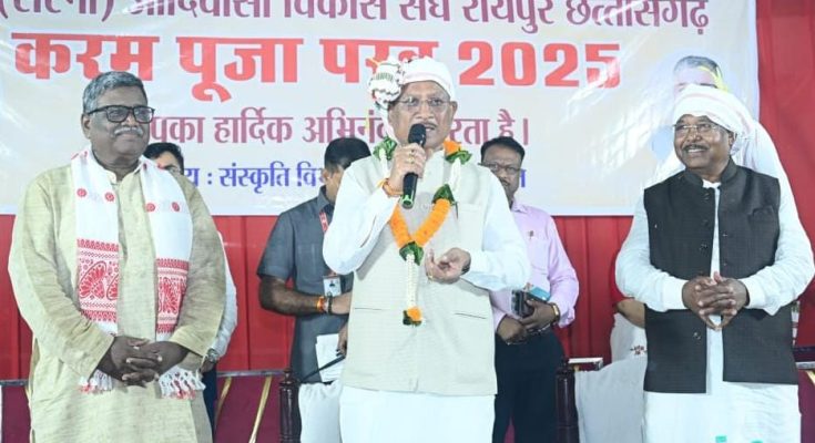 रायपुर, 3 अक्टूबर 2025 : मुख्यमंत्री श्री विष्णु देव साय आज शाम राजधानी स्थित अखिल भारतीय वनवासी आश्रम परिसर में उरांव (सरना) आदिवासी विकास संघ रायपुर द्वारा आयोजित करम पूजा परब 2025 महोत्सव में शामिल हुए।
