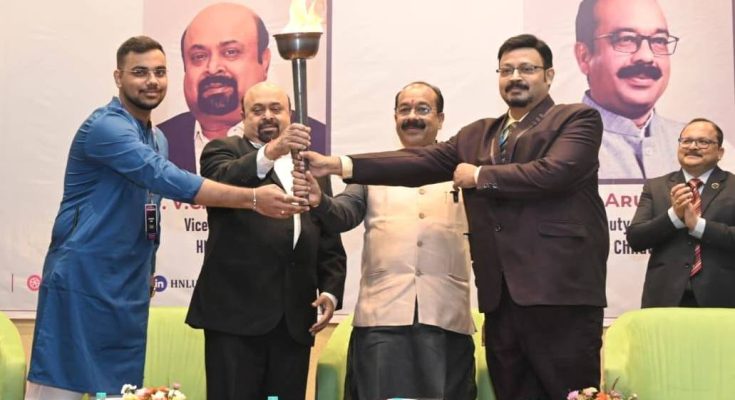 रायपुर, 10 अक्टूबर 2025 : उप मुख्यमंत्री तथा खेल एवं युवा कल्याण मंत्री श्री अरुण साव ने आज नवा रायपुर स्थित हिदायतुल्ला राष्ट्रीय विधि विश्वविद्यालय (HNLU) में अंतर-विश्वविद्यालय उत्सव एचएनएलयू कोलोसस और आईएमयूएनसी-2025 (HNLU Colossus and IMUNC-2025) का शुभारंभ किया। 10 अक्टूबर से 12 अक्टूबर तक चलने वाले इस तीन दिवसीय आयोजन में देशभर के 65 विधि विश्वविद्यालयों के 500 युवा हिस्सेदारी कर रहे हैं।