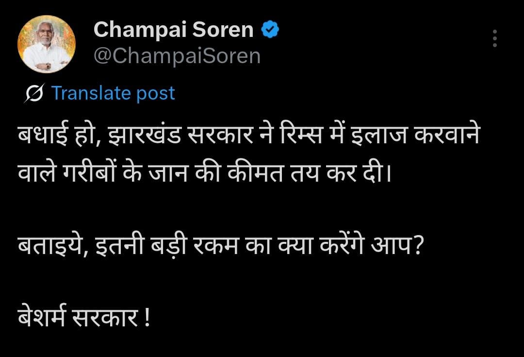 रांची (SHABD) :राज्य के पूर्व मुख्यमंत्री चंपाई सोरेन ने भी स्वास्थ्य व्यवस्था पर प्रश्नचिन्ह खड़े किए हैं। एक सोशल मीडिया पोस्ट में श्री सोरेन ने रिम्स में मरीजों की मौत के बाद परिजनों को 5 हजार रुपये की सहायता राशि दिए जाने की घोषणा को बेहद शर्मनाक बताया है। उन्होंने सरकार को बेशर्म करार देते हुए आरोप लगाया कि अब गरीबों की जान की कीमत तय की जा रही है। गौरतलब है कि कल रिम्स की गवर्निंग बॉडी ने रिम्स में इलाजरत मरीजों की मौत होने पर पांच हजार रुपये परिजनों को सहायता देने का निर्णय लिया था।