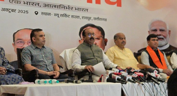 रायपुर । भारत के लौह पुरुष सरदार वल्लभभाई पटेल की 150वीं जयंती को समर्पित एक ऐतिहासिक राष्ट्रव्यापी अभियान ‘सरदार@150 यूनिटी मार्च’ के संबंध में बुधवार को सर्किट हाउस, रायपुर में एक महत्वपूर्ण प्रेस कॉन्फ्रेंस आयोजित की गई। छत्तीसगढ़ के उप मुख्यमंत्री श्री अरुण साव ने मीडिया को संबोधित करते हुए इस भव्य आयोजन की रूपरेखा प्रस्तुत की और युवाओं से सक्रिय भागीदारी का आह्वान किया।