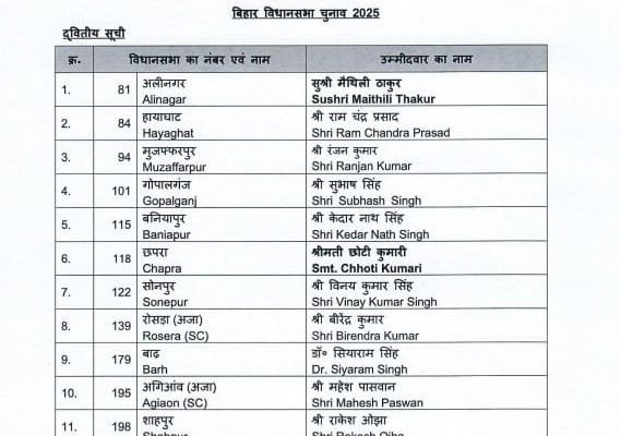पटना(SHABD) : भारतीय जनता पार्टी (भाजपा) ने आगामी बिहार विधानसभा चुनाव 2025 के लिए आज अपनी दूसरी सूची जारी कर दी है। इस सूची में 12 उम्मीदवारों के नाम शामिल हैं, जिनमें हाल ही में पार्टी में शामिल हुईं लोक गायिका मैथिली ठाकुर और पूर्व आईपीएस अधिकारी आनंद मिश्रा जैसे प्रमुख चेहरे शामिल हैं।