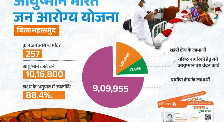 अब तक जिले में 10 लाख 16 हजार 800 हितग्राहियों के आयुष्मान कार्ड बन चुके हैं, जो निर्धारित लक्ष्य का लगभग 88.4 प्रतिशत है। इनमें ग्रामीण क्षेत्र के 9 लाख 9 हजार 955 और शहरी क्षेत्र के 1 लाख 6 हजार 845 लाभार्थी शामिल हैं। विकासखण्ड स्तर पर पिथौरा, बागबाहरा, बसना, सरायपाली और महासमुंद सभी क्षेत्रों में विशेष शिविरों एवं घर-घर संपर्क अभियान के माध्यम से कार्ड निर्माण का कार्य तीव्र गति से चल रहा है।
