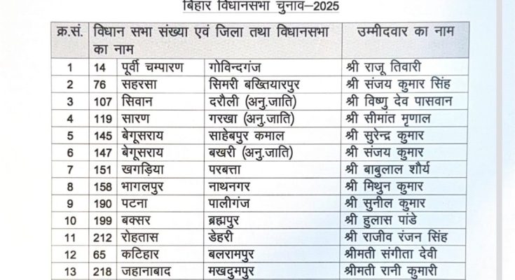 पार्टी को एनडीए गठबंधन में मिली 29 सीटों पर यह सूची जारी की गई है। इस सूची में पार्टी ने विभिन्न जिलों से उम्मीदवारों को मैदान में उतारा है, जिनमें कई आरक्षित सीटें भी शामिल हैं।