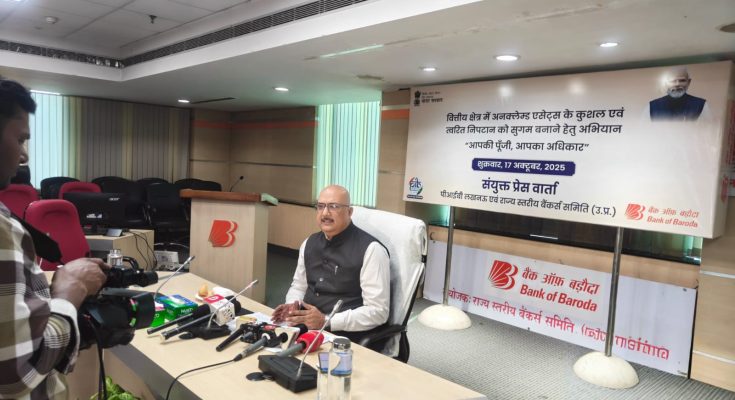 लखनऊ (PIB) : माननीया वित्त मंत्री, भारत सरकार द्वारा वित्तीय सेवाएँ विभाग, वित्त मंत्रालय, भारत सरकार के सहयोग से भारतीय रिज़र्व बैंक (आरबीआई); भारतीय बीमा नियामक एवं विकास प्राधिकरण (आईआरडीएआई); भारतीय प्रतिभूति एवं विनिमय बोर्ड (सेबी) और कॉर्पोरेट मामलों के मंत्रालय के अंतर्गत निवेशक शिक्षा एवं संरक्षण निधि प्राधिकरण (आईईपीएफ़ए) के वित्तीय क्षेत्र में बिना दावे वाली संपत्तियों हेतु अक्टूबर-दिसंबर 2025 तक तीन माह का राष्ट्रव्यापी अभियान प्रारंभ किया गया है। इस अभियान का शीर्षक “आपकी पूंजी, आपका अधिकार” है। यह जानकारी बैंक ऑफ़ बड़ौदा के संयोजन में कार्यरत राज्य स्तरीय बैंकर्स समिति (एसएलबीसी), लखनऊ द्वारा बैंक के “बड़ौदा हाउस”, गोमती नगर, स्थित अंचल कार्यालय में आयोजित प्रेस वार्ता में दी गई।