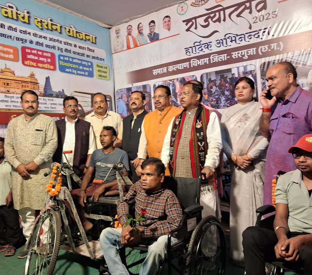 रायपुर, 03 नवम्बर 2025 : छत्तीसगढ़ राज्य स्थापना दिवस के 25 वर्ष पूर्ण होने पर रजत जयंती के रूप में मनाया जा रहा है। इस अवसर पर राजधानी रायपुर सहित राज्य के सभी जिलों में हर्षोल्लास के साथ राज्योत्सव का आयोजन किया जा रहा है। इसी कड़ी में सरगुजा (अम्बिकापुर) में आयोजित राज्योत्सव समारोह में आदिम जाति विकास मंत्री श्री राम विचार नेताम शामिल हुए। उन्होंने विभिन्न विभागाों द्वारा लगाए गए स्टॉलो का भी निरीक्षण कियाा। इस दौरान समाज कल्याण विभाग द्वारा संचालित योजनाओं के तहत हितग्रहियों एवं दिव्यांगजनों को सहायक उपकरण एवं वित्तीय सहायता प्रदान की।
