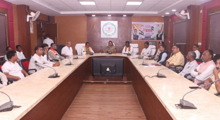 रायपुर, 07 नवंबर 2025 : प्रधानमंत्री श्री नरेंद्र मोदी द्वारा नई दिल्ली से राष्ट्रीय गीत “वंदे मातरम्” के 150 वर्ष पूर्ण होने पर वर्षभर चलने वाले समारोह के शुभारंभ के अवसर पर पूरे देश में उल्लासपूर्ण माहौल रहा। इसी कड़ी में जिला सूरजपुर में संयुक्त जिला कार्यालय कलेक्ट्रेट के सभाकक्ष में महिला एवं बाल विकास मंत्री श्रीमती लक्ष्मी राजवाड़े की मौजूदगी में कार्यक्रम आयोजित किया गया।