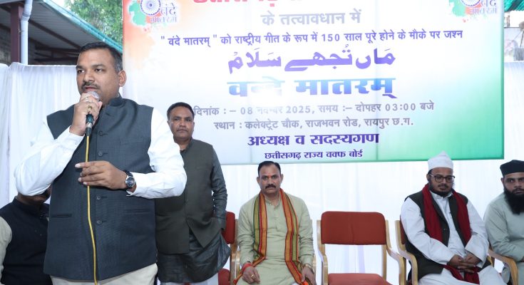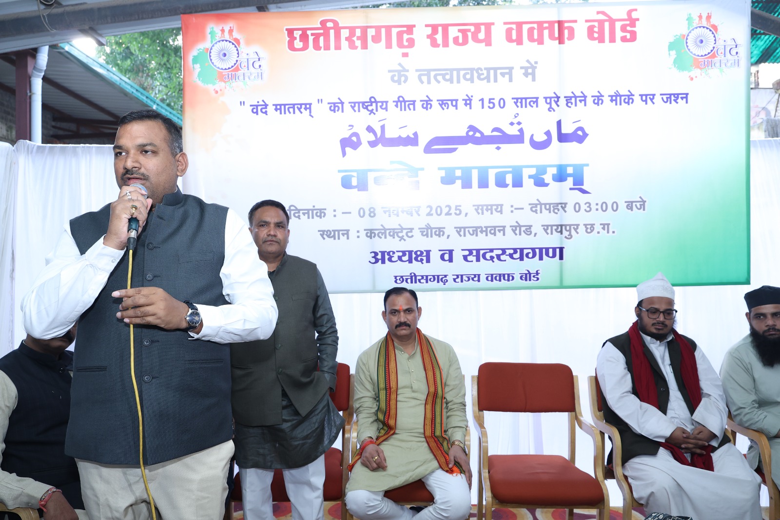 रायपुर 08 नवम्बर 2025। भारत के यशस्वी प्रधानमंत्री श्री नरेन्द्र मोदी जी के मार्गदर्शन एवं भारत सरकार, संस्कृति मंत्रालय नई दिल्ली तथा प्रदेश के मुख्यमंत्री श्री विष्णु देव साय के निर्देशानुसार राष्ट्र गीत वंदे मातरम को 150 वर्ष पूर्ण होने पर छत्तीसगढ़ राज्य वक्फ बोर्ड में सामुहिक राष्ट्र गीत गायन कार्यक्रम का आयोजन किया गया जिसमें मुख्य रूप से छत्तीसगढ़ प्रदेश के अल्पसंख्यक कल्याण विभाग के माननीय मंत्री श्री श्याम बिहारी जायसवाल, भाजपा के प्रदेश उपाध्यक्ष/वंदे मातरम् कार्यक्रम के प्रदेश प्रभारी, श्री नंदन लाल जैन मुख्य अतिथि के रूप में उपस्थित हुए।