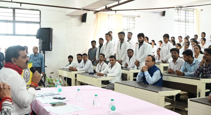 रायपुर, 09 नवंबर 2025 : छत्तीसगढ़ शासन के उपमुख्यमंत्री श्री विजय शर्मा अपने संक्षिप्त एक दिवसीय प्रवास के दौरान स्व बलिराम स्मृति मेडिकल कॉलेज के चरक सभागार में मेडिकल कॉलेज के अध्ययनरत चिकित्सकों से संवाद करते हुए कहा कि सुरक्षा कैंपों के समीप संवेदनशील ग्रामों में मेडिकल कॉलेज के चिकित्सकों द्वारा आयोजित स्वास्थ्य शिविर एक नई पहल है, जो चिकित्सकों को बस्तर क्षेत्र की जनता से जुड़ने के साथ एक अनोखा अनुभव प्राप्त करने का अवसर है। हमारे सुझाव को स्वीकार कर कालेज के डीन और उनकी टीम के द्वारा संवेदनशील ग्रामों में एक-दो दिवसीय स्वास्थ्य शिविर आयोजित किया इसके लिए बधाई।
