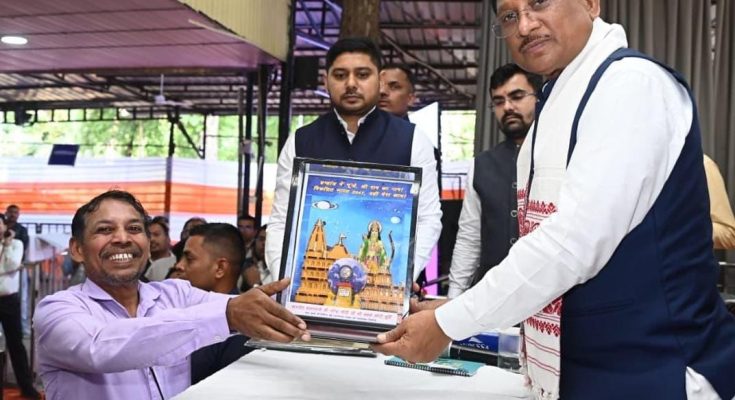 रायपुर, 13 नवंबर 2025 : छत्तीसगढ़ के भिलाई निवासी 55 वर्षीय श्री अंकुश देवांगन ने अपनी अनूठी कला से एक बार फिर सबको आश्चर्यचकित कर दिया। आज जनदर्शन कार्यक्रम के दौरान उन्होंने मुख्यमंत्री श्री विष्णु देव साय को एक विशेष फ्रेम भेंट किया, जिसमें संगमरमर को बारीकी से तराशकर बनाई गई प्रधानमंत्री श्री नरेंद्र मोदी की छोटी प्रतिमा लगी हुई है। फ्रेम के पीछे अयोध्या स्थित नवनिर्मित श्री रामलला मंदिर की भव्य प्रतिकृति भी उकेरी गई है। इस अद्भुत कृति को देखकर मुख्यमंत्री ने श्री देवांगन की भरपूर प्रशंसा की और उन्हें शुभकामनाएं दीं।