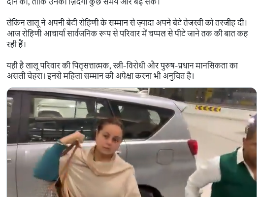 सोशल मीडिया प्लेटफॉर्म एक्स पर लिखा, ‘’रोहिणी आचार्या ने अपनी जान की परवाह किए बिना अपने पिता लालू प्रसाद को किडनी दान की, ताकि उनकी ज़िंदगी कुछ समय और बढ़ सके। लेकिन लालू ने अपनी बेटी रोहिणी के सम्मान से ज़्यादा अपने बेटे तेजस्वी को तरजीह दी। आज रोहिणी आचार्या सार्वजनिक रूप से परिवार में चप्पल से पीटे जाने तक की बात कह रही हैं। यही है लालू परिवार की पितृसत्तात्मक, स्त्री-विरोधी और पुरुष-प्रधान मानसिकता का असली चेहरा। इनसे महिला सम्मान की अपेक्षा करना भी अनुचित है।”