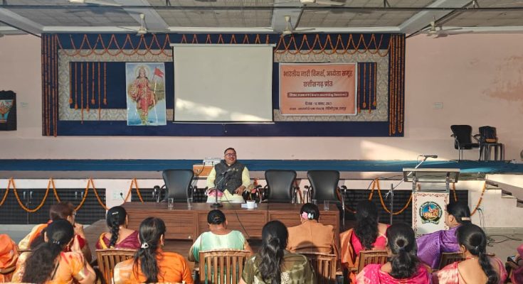 भारतीय नारी विमर्श, अध्येता समूह छत्तीसगढ़ प्रान्त का विचार मंथन सत्र रविवार को सरस्वती शिक्षण संस्थान रोहिणीपुरम में आयोजित हुआ। जबलपुर से आईं नारी विमर्श की क्षेत्रीय संयोजिका डॉ नूपुर निखिल देशकर ने सत्र के प्रारंभ में विषय समझाते हुए कहा कि नारी और विमर्श दो बिंदु हैं। भारत मे आज प्रबुद्ध नारियों के बीच इस विमर्श की आवश्यकता क्यों पड़ी? जहां स्त्रियां शोषित थीं, वहां उन्होंने आवाज़ उठाई। शक्ति ही शिव का आधार है। धर्म, अर्थ, काम और मोक्ष चारों ही में उसकी समान भूमिका है। स्वतंत्रता पूर्व नारी विमर्श ने विकृत भाव पैदा किया। औपनिवेशिक स्वरूप ने इसे बिगाड़ा। विदेशी महिला साहित्यकारों के साहित्य ने भारतीय महिलाओं पर प्रभाव डाला। 1837 में पहली बार नारी विमर्श शब्द आया।1970 के बाद भारत के विश्वविद्यालयों में पश्चिम के साहित्यकारो को पढ़ाया जाने लगा। परिणामस्वरूप पितृसत्ता, लैंगिक उत्पीड़न जैसे विषयों पर बहस करने लगे।वैश्वीकरण व बाज़ारीकरण ने महिलाओं के स्वरूप को बिगाड़ा। नारी को उपभोक्ता व उत्पाद बनाया गया।बॉलीवुड ने भी स्त्रियों की छवि को बदल दिया। नारी अधिकारों की याचक नहीं, कर्तव्यों की शक्ति है।