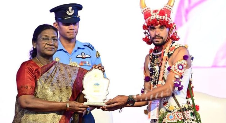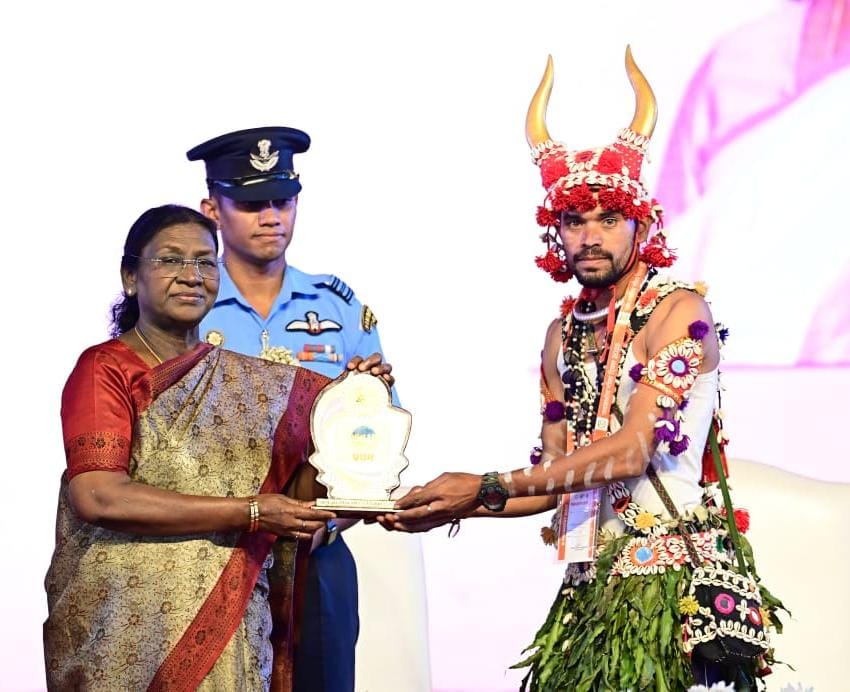 रायपुर, 24 नवम्बर 2025 :जनजातीय गौरव दिवस 2025 पर सरगुजा जिला मुख्यालय अंबिकापुर में आयोजित राज्य स्तरीय शहीद वीर नारायण सिंह स्मृति लोक कला महोत्सव में कोंडागांव जिले की लिंगों घोटुल मांदरी नृत्य दल ने शानदार प्रदर्शन करते हुए प्रथम स्थान हासिल किया। समारोह की मुख्य अतिथि देश की राष्ट्रपति श्रीमती द्रौपदी मुर्मु के हाथों को प्रथम स्थान प्राप्त करने वाले जिले की मांदरी नृत्य दल को सम्मान मिला।