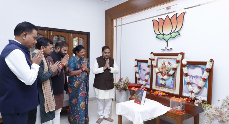 रायपुर। भारतीय जनता पार्टी के प्रदेश कार्यालय (कुशाभाऊ ठाकरे परिसर) में बुधवार को संविधान दिवस पर क्षेत्रीय संगठन मंत्री अजय जम्वाल ने संविधान को नमन किया तथा संविधान निर्माताओं को स्मरण करते हुए उन्हें भावपूर्ण श्रद्धांजलि अर्पित की। इस मौके पर श्री जम्वाल ने कहा कि संविधान लोकतंत्र की गीता है। यह देश के मान, सम्मान और स्वाभिमान का प्रतीक है। हम सबका कर्तव्य है कि हम इसे आत्मसात कर संविधान निर्माताओं के स्वप्नों को साकार करने प्रतिपल संकल्पित रहें। देश के सभी लोगों को संविधान का पालन करना चाहिए। इस अवसर पर उपस्थित लोगों ने मां भारती, डॉ. श्यामाप्रसाद मुखर्जी और पं. दीनदयाल उपाध्याय के तैल चित्र पर पुष्पांजलि अर्पित की।