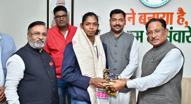 रायपुर, 26 नवंबर 2025 : महिला कबड्डी विश्व कप की स्टार खिलाड़ी छत्तीसगढ़ निवासी संजू देवी ने विगत दिवस मुख्यमंत्री श्री विष्णु देव साय से राजधानी रायपुर स्थित उनके निवास कार्यालय में सौजन्य भेंट की।