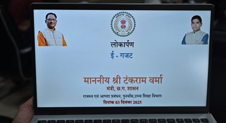 रायपुर, 3 दिसम्बर 2025 : मुख्यमंत्री श्री विष्णुदेव साय के नेतृत्व में प्रशासनिक प्रक्रियाओं को सरल, पारदर्शी और त्वरित बनाने की दिशा में एक और महत्वपूर्ण कदम बढ़ाते हुए राजस्व मंत्री श्री टंकराम वर्मा ने मंत्रालय में ई-गजट ऑनलाईन पोर्टल का शुभारंभ किया। इस अवसर पर राजस्व एवं आपदा प्रबंधन विभाग की सचिव श्रीमती रीना बाबासाहेब कंगाले उपस्थित थीं।