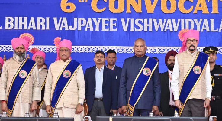 रायपुर. 4 दिसम्बर 2025 :अटल बिहारी वाजपेयी विश्वविद्यालय के छठवें दीक्षांत समारोह का आयोजन आज पूर्व राष्ट्रपति श्री रामनाथ कोविंद के मुख्य आतिथ्य में गरिमामय वातावरण में किया गया। कार्यक्रम की अध्यक्षता राज्यपाल श्री रमेन डेका ने की। अति विशिष्ट अतिथि के तौर पर मुख्यमंत्री श्री विष्णु देव साय, विशिष्ट अतिथि उपमुख्यमंत्री श्री अरुण साव तथा उच्च शिक्षा मंत्री श्री टंकराम वर्मा शामिल हुए। कार्यक्रम में विश्वविद्यालय के कुलपति आचार्य डॉ. दिवाकर नाथ वाजपेयी उपस्थित रहे। समारोह में 64 शोद्यार्थियों को शोध उपाधि, 92 गोल्ड मेडल एवं 36950 स्नातक एवं स्नातकोत्तर उपाधि दी गई।