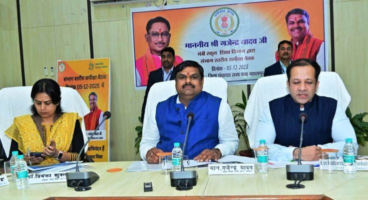 रायपुर, 5 दिसम्बर 2025 :स्कूल शिक्षा मंत्री श्री गजेन्द्र यादव की अध्यक्षता में रायपुर संभाग के स्कूल शिक्षा विभाग की संभागीय समीक्षा बैठक आज महासमुंद के जिला पंचायत कार्यालय के सभागार में सम्पन्न हुई। मंत्री श्री यादव ने कहा कि शिक्षा विभाग का मूल उद्देश्य गुणवत्तापूर्ण अध्ययन-अध्यापन सुनिश्चित करना है और इसके लिए सभी स्तरों पर समर्पित प्रयास आवश्यक हैं। बैठक में सचिव स्कूल शिक्षा विभाग श्री सिद्धार्थ कोमल परदेशी, आयुक्त समग्र शिक्षा डॉ. प्रियंका शुक्ला सहित विभाग के वरिष्ठ अधिकारी, डीईओ, डीएमसी, बीईओ एवं बीआरसी उपस्थित रहे।