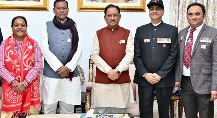 रायपुर, 07 दिसंबर 2025 :मुख्यमंत्री श्री विष्णु देव साय से आज राजधानी रायपुर स्थित मुख्यमंत्री निवास कार्यालय में छत्तीसगढ़ राज्य सैनिक कल्याण बोर्ड के सचिव ब्रिगेडियर विवेक शर्मा ने सौजन्य भेंट की। इस अवसर पर उन्होंने मुख्यमंत्री श्री साय को सशस्त्र सेना झंडा दिवस के प्रतीक स्वरूप सम्मान बैज लगाया तथा संचालनालय सैनिक कल्याण द्वारा संचालित विभिन्न कल्याणकारी गतिविधियों एवं योजनाओं की विस्तृत जानकारी प्रदान की।