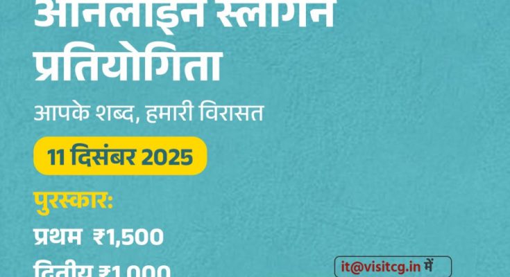 इसी कड़ी को आगे बढ़ाते हुए पर्यटन बोर्ड ने 15 दिसंबर 2025 तक ऑनलाइन स्लोगन प्रतियोगिता आयोजित करने का निर्णय लिया है। प्रतियोगिता का उद्देश्य छत्तीसगढ़ के प्राकृतिक सौंदर्य, सांस्कृतिक विरासत और पर्यटन स्थलों को नई दृष्टि से सामने लाना है। प्रतिभागियों को छत्तीसगढ़ के पर्यटन, संस्कृति, सौंदर्य, विरासत पर स्लोगन लिखना होगा।