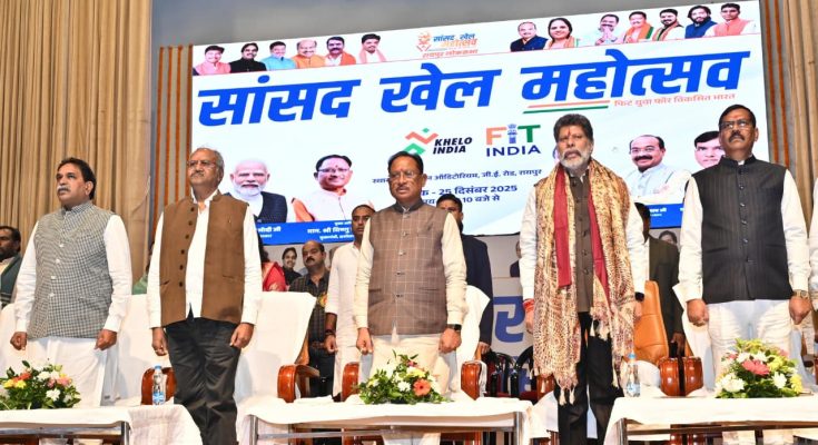 रायपुर, 25 दिसम्बर 2025 : सांसद खेल महोत्सव– ‘फिट युवा, विकसित भारत’ का समापन समारोह आज पं. दीनदयाल उपाध्याय ऑडिटोरियम, रायपुर में उत्साहपूर्ण और गरिमामय वातावरण में सम्पन्न हुआ। इस अवसर पर मुख्यमंत्री श्री विष्णु देव साय मुख्य अतिथि के रूप में उपस्थित रहे। कार्यक्रम के दौरान प्रधानमंत्री श्री नरेन्द्र मोदी, केन्द्रीय खेल एवं युवा कार्य मंत्री श्री मनसुख मांडविया तथा देशभर के सांसद वीडियो कॉन्फ्रेंसिंग के माध्यम से जुड़े और समापन समारोह को वर्चुअल रूप से संबोधित किया। ऑडिटोरियम में उपस्थित जनसमूह ने प्रधानमंत्री के प्रेरक उद्बोधन को ध्यानपूर्वक सुना।