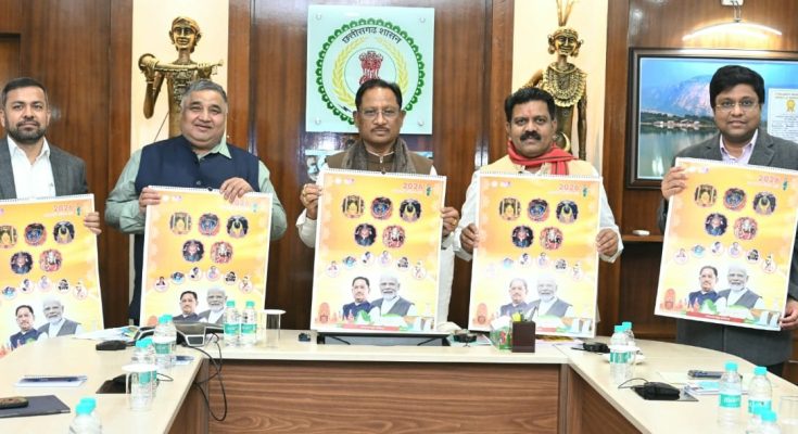 रायपुर, 28 दिसंबर 2025 :मुख्यमंत्री श्री विष्णु देव साय ने राजधानी रायपुर स्थित मुख्यमंत्री निवास कार्यालय में वर्ष 2026 के शासकीय कैलेंडर का विमोचन किया। वर्ष 2026 को राज्य सरकार द्वारा ‘महतारी गौरव वर्ष’ के रूप में मनाया जा रहा है। इसी थीम पर आधारित यह कैलेंडर सशक्त एवं समृद्ध छत्तीसगढ़ के संकल्प को अभिव्यक्त करता है।