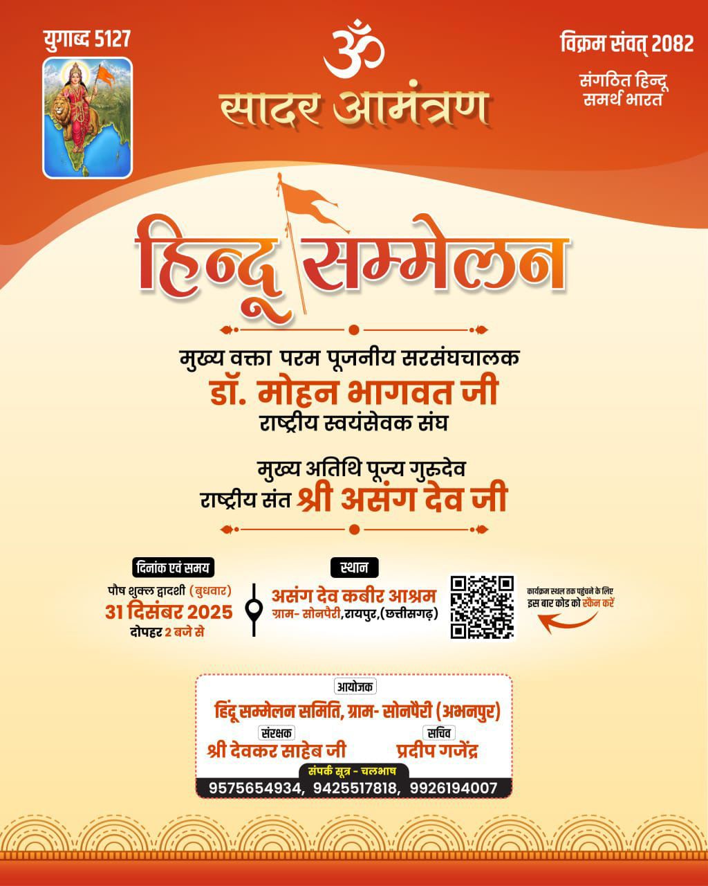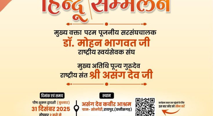 रायपुर। राष्ट्रीय स्वयंसेवक संघ स्थापना के शताब्दी वर्ष में पंच परिवर्तन के विषयों के साथ समाज में जागरण एवं लोगों की सक्रिय सहभागिता के साथ कार्यों को गति दे रहा है. इसी क्रम में 31 दिसंबर 2025 बुधवार को हिन्दू सम्मेलन का आयोजन किया गया है. कार्यक्रम रायपुर के अभनपुर के सोनपैरी स्थित असंग देव कबीर आश्रम में आयोजित होगा.