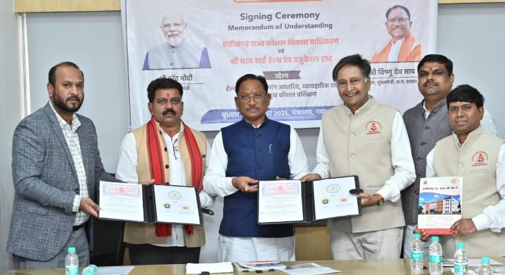 रायपुर 1 जनवरी 2026 : मुख्यमंत्री श्री विष्णु देव साय की उपस्थिति में नवा रायपुर स्थित मंत्रालय (महानदी भवन) में छत्तीसगढ़ राज्य कौशल विकास प्राधिकरण एवं श्री सत्य साईं हेल्थ एंड एजुकेशन ट्रस्ट के बीच एक महत्वपूर्ण समझौता ज्ञापन (एमओयू) पर हस्ताक्षर किए गए।