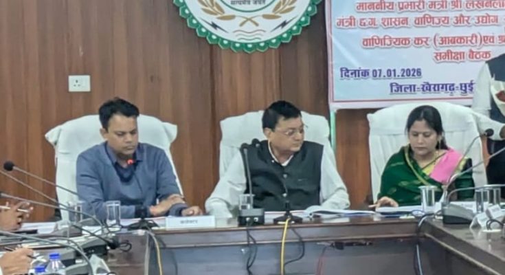 रायपुर, 07 जनवरी 2026 : वाणिज्य, उद्योग एवं श्रम मंत्री तथा खैरागढ़–छुईखदान–गंडई जिले के प्रभारी मंत्री श्री लखनलाल देवांगन ने आज जिला कलेक्टोरेट खैरागढ़ के सभाकक्ष में अधिकारियों की समीक्षा बैठक लेकर जिले में संचालित विकास कार्यों एवं जनकल्याणकारी योजनाओं की प्रगति की समीक्षा की।