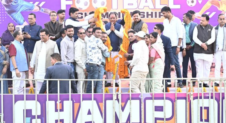 रायपुर, 13 जनवरी 2026 :मुख्यमंत्री श्री विष्णु देव साय ने आज रायपुर जिले के खरोरा में आयोजित सीएम ट्रॉफी ऑल इंडिया फुटबॉल चैंपियनशिप के भव्य समापन समारोह के अवसर पर क्षेत्रवासियों के लिए कई महत्वपूर्ण घोषणाएं की। मुख्यमंत्री श्री साय ने समोदा बैराज के निर्माण कार्य में तेजी लाने, खरोरा में बायपास रोड तथा गौरव पथ के निर्माण की घोषणा की।
