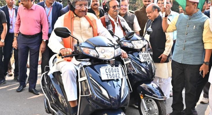 मुख्यमंत्री श्री साय ने सड़क सुरक्षा का संदेश देते हुए स्वयं हेलमेट पहनकर बाइक चालकों के दल के साथ स्कूटी चलाई।कार्यक्रम में मुख्यमंत्री श्री साय ने राजधानी रायपुर के पंडरी में आधुनिक लाइसेंस सेंटर कार्यालय भवन पंडरी का भूमिपूजन और प्रदेश भर में मुख्यमंत्री ग्रामीण बस योजना के तहत 12 नवीन मार्गों में 12 नवीन बसों का शुभारंभ किया।