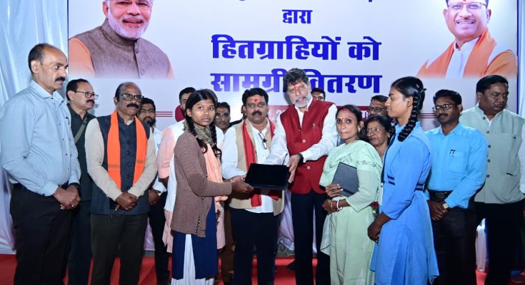 रायपुर, 06 फरवरी 2026 : स्थानीय सर्किट हाऊस में शुक्रवार की शाम उप मुख्यमंत्री श्री विजय शर्मा के मुख्य आतिथ्य में आयोजित एक गरिमामय समारोह में शासन की जनकल्याणकारी योजनाओं का सीधा लाभ जब जमीनी स्तर पर उतरा, तो हितग्राहियों के चेहरे खिल उठे। उप मुख्यमंत्री श्री विजय शर्मा, वन मंत्री श्री केदार कश्यप एवं विधायक श्री किरण सिंह देव ने विभिन्न विभागों के माध्यम से पात्र लोगों को सामग्री और सहायता राशि वितरित कर सबका साथ, सबका विकास के मंत्र को चरितार्थ किया।