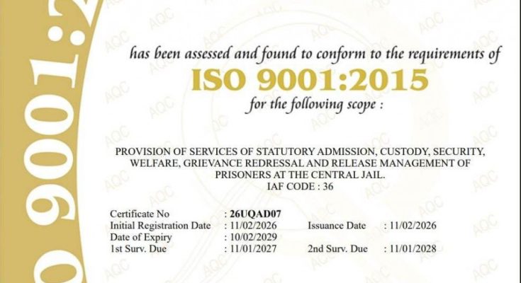 रायपुर, 12 फरवरी 2026 :छत्तीसगढ़ की जेल व्यवस्थाओं में गुणवत्ता, पारदर्शिता और जवाबदेही को सुदृढ़ करने की दिशा में एक महत्वपूर्ण उपलब्धि हासिल हुई है। उप मुख्यमंत्री एवं जेल विभाग के प्रभारी मंत्री विजय शर्मा के निर्देशन में राज्य की जेलों की व्यवस्थाओं को बेहतर बनाने के लिए लगातार प्रयास किए जा रहे है। इन्हीं प्रयासों का ही यह परिणाम है कि छत्तीसगढ़ की सेंट्रल जेल रायपुर, दुर्ग, बिलासपुर एवं अम्बिकापुर को अंतरराष्ट्रीय गुणवत्ता मानक आईएसओ 9001ः2015 का प्रमाणन प्राप्त हुआ है।