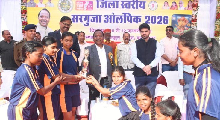 रायपुर, 13 फरवरी 2026 :आदिम जाति विकास तथा कृषि विकास एवं किसान कल्याण मंत्री श्री रामविचार नेताम के मुख्य आतिथ्य में बलरामपुर में जिला स्तरीय सरगुजा ओलंपिक का समापन हुआ। खेल एवं युवा कल्याण विभाग द्वारा बलरामपुर के स्वामी आत्मानंद हिन्दी माध्यम विद्यालय के खेल मैदान में 10 फरवरी से 12 फरवरी तक इसका आयोजन किया गया था। इस तीन दिवसीय आयोजन में खेल प्रतिभाओं के उत्साह, कौशल और ऊर्जा का अद्भुत संगम देखने को मिला।