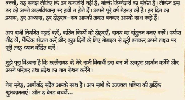 उन्होंने विश्वास व्यक्त किया कि छत्तीसगढ़ के सभी विद्यार्थी इस बार भी उत्कृष्ट प्रदर्शन करेंगे और अपने परिवार तथा प्रदेश का नाम रोशन करेंगे।