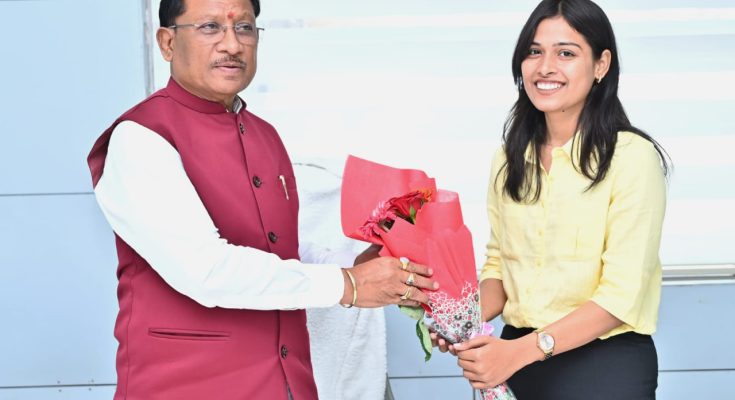 रायपुर ,18 फरवरी 2026 : मुख्यमंत्री श्री विष्णुदेव साय ने आज मंत्रालय महानदी भवन स्थित अपने कार्यालय में सीडीएस परीक्षा में ऑल इंडिया चौथा रैंक प्राप्त करने वाली मुंगेली की सुश्री सुप्रिया को सम्मानित किया। उन्होंने सुप्रिया और उनके परिजनों को पुष्पगुच्छ भेंटकर बधाई एवं शुभकामनाएं दी और मुँह मीठा कराया।