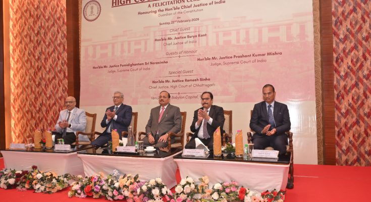 रायपुर : छत्तीसगढ़ उच्च न्यायालय द्वारा आज दिनांक 22 फरवरी, 2026 को होटल बेबीलॉन कैपिटल, रायपुर में भारत के मुख्य न्यायमूर्ति माननीय श्री न्यायमूर्ति सूर्यकांत के सम्मान में एक गरिमामय अभिनंदन समारोह का आयोजन किया गया।
