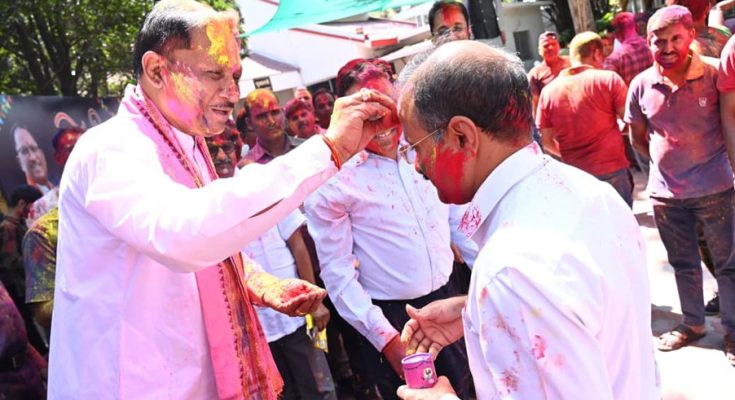 रायपुर, 4 मार्च 2026 : मुख्यमंत्री श्री विष्णु देव साय ने आज राजधानी रायपुर स्थित मुख्यमंत्री निवास कार्यालय में अधिकारियों और कर्मचारियों के साथ पूरे उत्साह और उमंग के साथ होली का पर्व मनाया। पारंपरिक फाग गीतों और हर्षोल्लास के वातावरण में रंग और उल्लास से सराबोर इस अवसर पर सभी ने एक-दूसरे को गुलाल लगाकर होली की शुभकामनाएँ दीं। अधिकारियों और कर्मचारियों ने मुख्यमंत्री श्री साय को गुलाल लगाकर उन्हें बधाई दी, वहीं मुख्यमंत्री श्री साय ने भी आत्मीयता के साथ सभी को गुलाल लगाकर रंगोत्सव की शुभकामनाएँ दीं और स्नेह, विश्वास तथा आपसी भाईचारे का संदेश दिया।