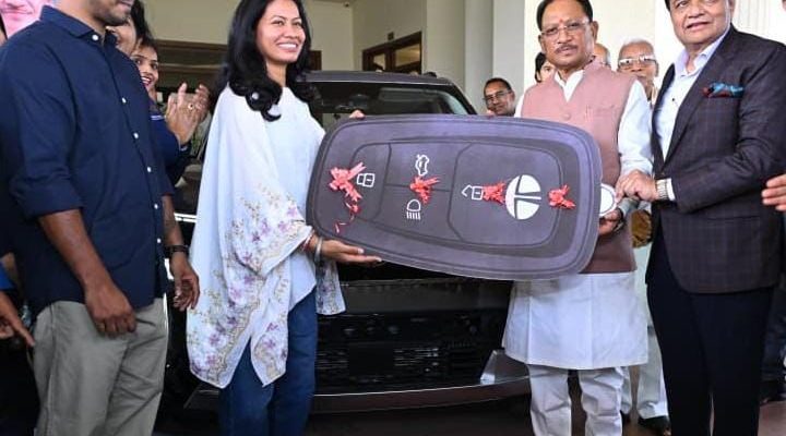 रायपुर 14 मार्च 2026/ मुख्यमंत्री श्री विष्णुदेव साय ने आज नवा रायपुर स्थित अपने निवास में आयोजित एक गरिमामय समारोह में भारतीय महिला क्रिकेट टीम की फिजियोथेरेपिस्ट और छत्तीसगढ़ की बेटी श्रीमती आकांक्षा सत्यवंशी को टाटा सिएरा कार उपहार स्वरूप प्रदान की। इस अवसर पर मुख्यमंत्री ने श्रीमती आकांक्षा को बधाई देते हुए कहा कि हमारी बेटियों ने विश्व कप जीतकर देश का गौरव बढ़ाया है। उन्होंने महिला क्रिकेट टीम के सम्मान और प्रोत्साहन के लिए टाटा मोटर्स द्वारा कार उपहार देने की इस पहल की सराहना की।