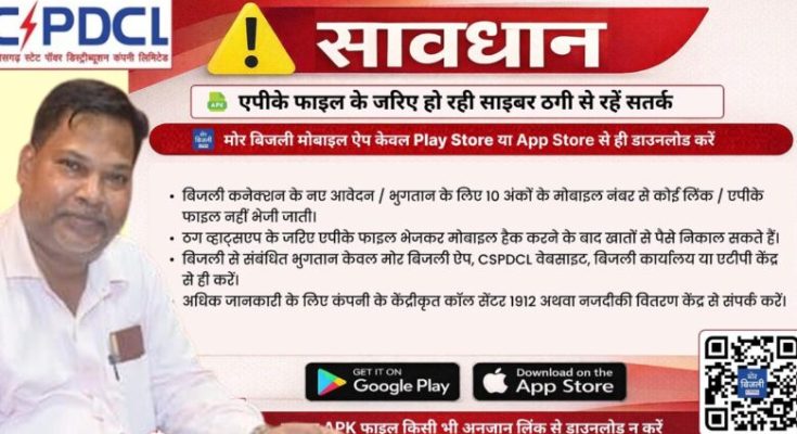 रायपुर, 15 मार्च 2026 : मुख्यमंत्री बिजली बिल भुगतान समाधान योजना के पंजीयन अथवा किसी भी प्रकार के भुगतान के लिए किसी अनजान वॉट्सएप, मेल अथवा एसएमएस पर क्लिक करने से बचें। मुख्यमंत्री बिजली बिल भुगतान समाधान योजना के नाम पर किसी भी लिंक या एपीके फाइल को डाउनलोड न करें। छत्तीसगढ राज्य पॉवर कंपनी अपनी किसी भी योजना अथवा सेवा के लिए कभी भी कोई एपीके पाइल अथवा कोई वेब लिंक नहीं भेजती है।
