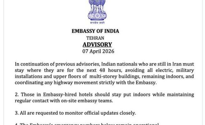 ईरान के भीतर या ईरान की सीमा चौकियों तक किसी भी तरह की आवाजाही पर विचार केवल तेहरान स्थित भारतीय दूतावास के साथ समन्वय और स्पष्ट निर्देश प्राप्त करने के बाद ही करें। भारतीय दूतावास ने ईरान में मौजूद भारतीय नागरिकों की सहायता और सलाह के लिए आपातकालीन स्थिति में संपर्क करने के लिए हेल्पलाइन मोबाइल नंबर: +98 912 810 9115, +98 912 810 9102, +98 912 810 9109, +98 993 217 9359 और Email: cons.tehran@mea.gov.in जारी किया है है।