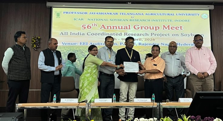 यह सम्मान डॉ. प्रताप सिंह, माननीय कुलपति, महाराणा प्रताप कृषि एवं प्रौद्योगिकी विश्वविद्यालय, उदयपुर; डॉ. एस.के. राव, पूर्व कुलपति, राजमाता विजयाराजे सिंधिया कृषि विश्वविद्यालय, ग्वालियर; डॉ. के.एच. सिंह, निदेशक, आईसीएआर-राष्ट्रीय सोयाबीन अनुसंधान संस्थान, इंदौर तथा डॉ. आर.के. माथुर, निदेशक, आईसीएआर-भारतीय तिलहन अनुसंधान संस्थान, हैदराबाद द्वारा 09 अप्रैल 2026 को हैदराबाद स्थित प्रोफेसर जयशंकर तेलंगाना कृषि विश्वविद्यालय, राजेंद्र नगर में आयोजित अखिल भारतीय समन्वित अनुसंधान परियोजना (सोयाबीन) की 56वीं वार्षिक समूह बैठक में प्रदान किया गया। इंदिरा गांधी कृषि विश्वविद्यालय के कुलपति डॉ. गिरीश चंदेल ने पुरस्कृत अनुसंधान दल के टीम लीडर एवं सदस्यों को इस उपलब्धि के लिए बधाई और शुभकामनाएं दीं हैं।