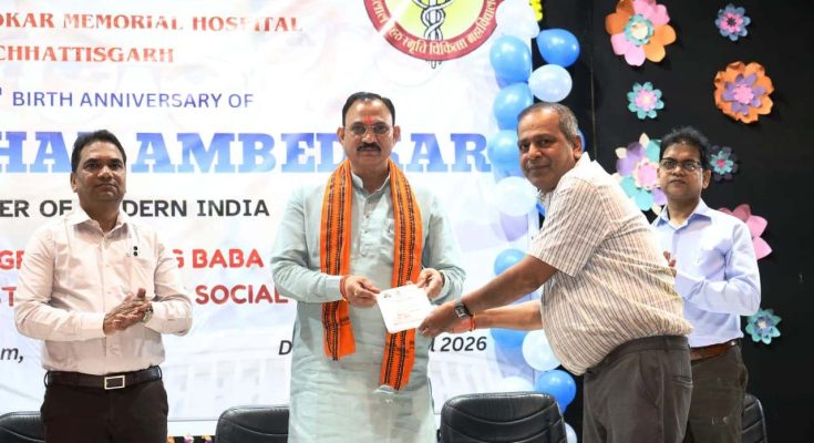 रायपुर, 14 अप्रैल 2026 : पंडित जवाहरलाल नेहरू स्मृति चिकित्सा महाविद्यालय एवं डॉ. भीमराव अम्बेडकर स्मृति चिकित्सालय, रायपुर में आज संविधान निर्माता डॉ. भीमराव अम्बेडकर की जयंती हर्षोल्लास एवं गरिमामय वातावरण में मनाई गई। इस अवसर पर आयोजित कार्यक्रम में मुख्य अतिथि के रूप में स्वास्थ्य मंत्री श्री श्याम बिहारी जायसवाल उपस्थित रहे। उन्होंने चिकित्सालय परिसर में स्थित बाबा साहेब की प्रतिमा पर पुष्प अर्पित कर उनके संदेशों को याद किया।