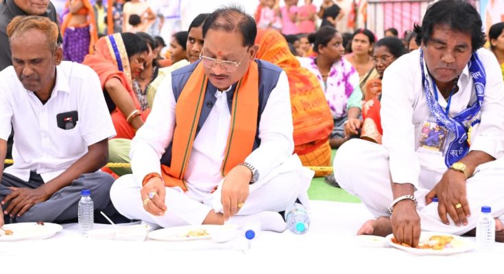 रायपुर, 14 अप्रैल 2026 : मुख्यमंत्री श्री विष्णु देव साय आज राजधानी रायपुर के शंकरनगर स्थित दुर्गा मैदान में डॉ. भीमराव आंबेडकर की 135वीं जयंती के अवसर पर आयोजित समरसता भोज कार्यक्रम में शामिल हुए। इस दौरान मुख्यमंत्री श्री साय ने जनप्रतिनिधियों और आमजन के साथ बैठकर भोजन किया तथा स्वयं लोगों को भोजन परोसकर सामाजिक समरसता का संदेश दिया।