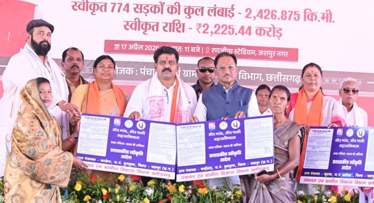 रायपुर 17 अप्रैल 2026/ छत्तीसगढ़ शासन की महत्वाकांक्षी पहल “मोर गांव, मोर पानी, मोर तरिया महाअभियान” का आज जशपुर के रणजीता स्टेडियम में मुख्यमंत्री श्री विष्णुदेव साय ने शुभारंभ किया। अभियान के अंतर्गत “नवा तरिया, आय के जरिया” के तहत प्रदेश में 500 नए तरिया (तालाब) के निर्माण का भी शिलान्यास किया। इससे जल संचयन, भूजल स्तर में वृद्धि और कृषि कार्यों के लिए सिंचाई सुविधा में सुधार होगा। इस अभियान के माध्यम से जल संरक्षण, जल संवर्धन और ग्रामीण आजीविका को सशक्त बनाने की दिशा में बड़े स्तर पर कार्य किए जाएंगे।