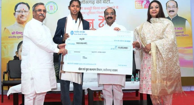 रायपुर, 18 अप्रैल 2026 : भारत को कबड्डी विश्वकप और एशियन चैंपियनशिप दिलाने में अहम भूमिका निभाने वाली संजू देवी को राज्य शासन के खेल एवं युवा कल्याण विभाग द्वारा 50 लाख रुपए की प्रोत्साहन राशि प्रदान की गई है। छत्तीसगढ़ में पहली बार किसी खिलाड़ी को इतनी बड़ी प्रोत्साहन राशि दी गई है। उप मुख्यमंत्री तथा खेल एवं युवा कल्याण मंत्री श्री अरुण साव ने आज नवा रायपुर स्थित अपने निवास कार्यालय में आयोजित सम्मान समारोह में उन्हें यह राशि सौंपी। श्री साव ने इस दौरान बिलासपुर के चिंगराजपारा कबड्डी क्लब को कबड्डी मैट भी प्रदान किया।