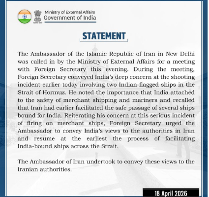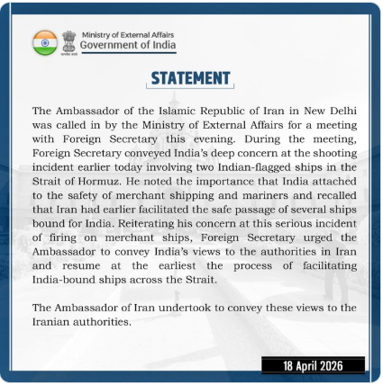 नई दिल्ली(SHABD): हॉर्मुज जलडमरूमध्य में भारतीय ध्वज वाले दो जहाजों से जुड़े गोलीबारी के हालिया घटनाक्रम पर भारत ने गहरी चिंता जताई है। इस सिलसिले में नई दिल्ली में इस्लामिक रिपब्लिक ऑफ ईरान के राजदूत को विदेश मंत्रालय ने तलब किया।