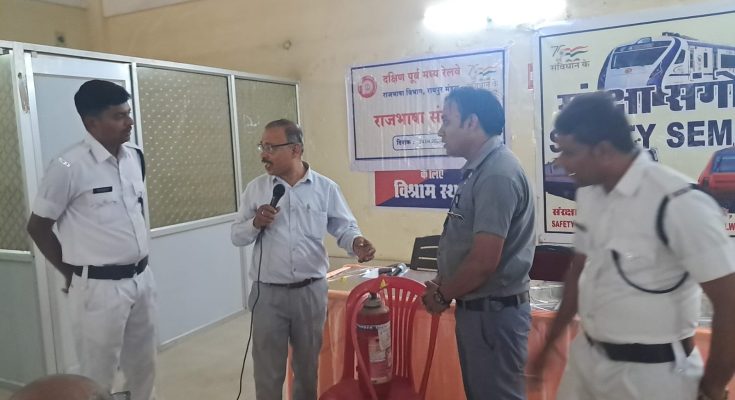 रायपुर- 24 अप्रैल, 2026 : दिनांक 24 अप्रैल 2026 को दक्षिण पूर्व मध्य रेलवे रायपुर रेल मंडल के संरक्षा विभाग द्वारा ट्रेनों के सुरक्षित परिचालन हेतु परिचालन, विद्युत परिचालन , यांत्रिक , इंजीनियरिंग तथा राजभाषा विभाग के कर्मचारियों के साथ मल्टी फंक्शन काम्पलेक्स, दुर्ग स्टेशन में संरक्षा संगोष्ठी का आयोजन किया गया। जिसमें निम्न बिंदुओं पर चर्चा की गई-